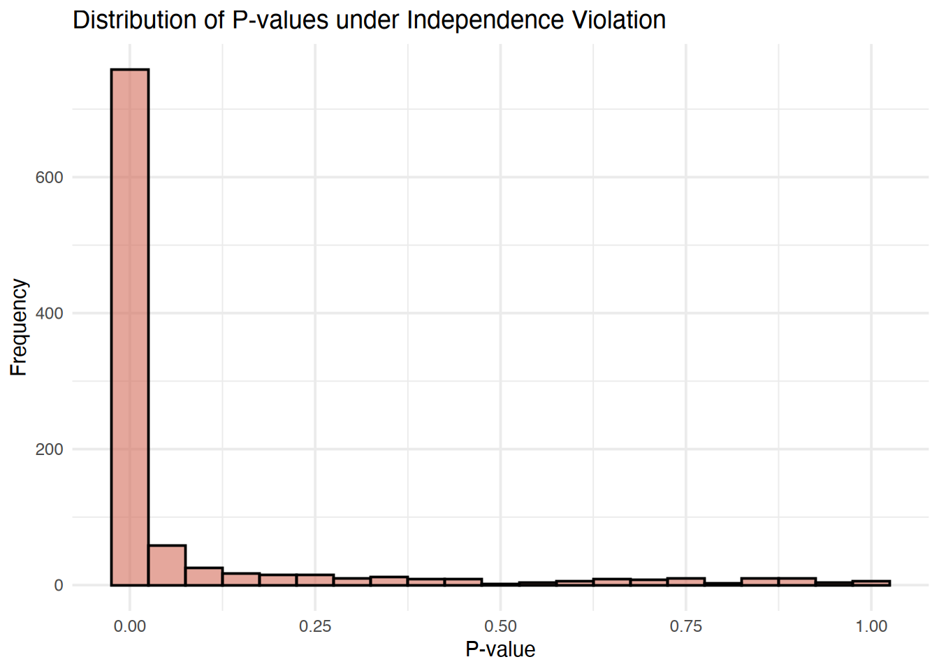 For example, suppose that a model assumes independence, a common assumption in many statistical models, but this violated due to the presence of a correlation, this will lead to P-values that are invalid, demonstrable by their failure to achieve asymptotic uniformity.